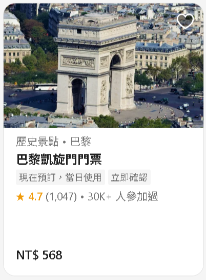 ⦁ 門票:成人全票12歐元,18歲以下免費,18-25歲歐盟公民免費。包含頂部平台及小型博物館(展示凱旋門歷史)。建議線上預約避開排隊。
